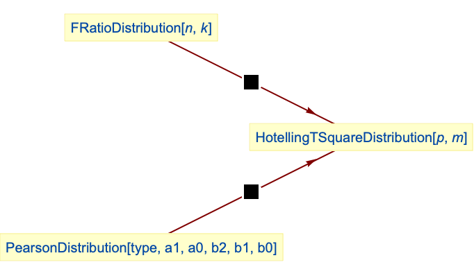distribution is related to a number of other distributions. As previously noted, HotellingTSquareDistribution is linked to statistical testing involving NormalDistribution and MultinormalDistribution. It was devised as a generalization of StudentTDistribution and in particular, HotellingTSquareDistribution[1,m] is proportional to StudentTDistribution[m]. Under appropriate assumptions, HotellingTSquareDistribution[p,m] is a special case of both PearsonDistribution (in the sense that its PDF is identical to that of PearsonDistribution[6,1,-((m(p-2))/(3+m-p)),2/(3+m-p),(2 m)/(3+m-p), 0]) and FRatioDistribution (in the sense that the CDF of HotellingTSquareDistribution[p,m] is precisely CDF[FRatioDistribution[p,1 - p + m], x (m - p + 1)/(m p)]). HotellingTSquareDistribution is also related to ChiDistribution, ChiSquareDistribution, BetaDistribution, FisherZDistribution, and LaplaceDistribution.
