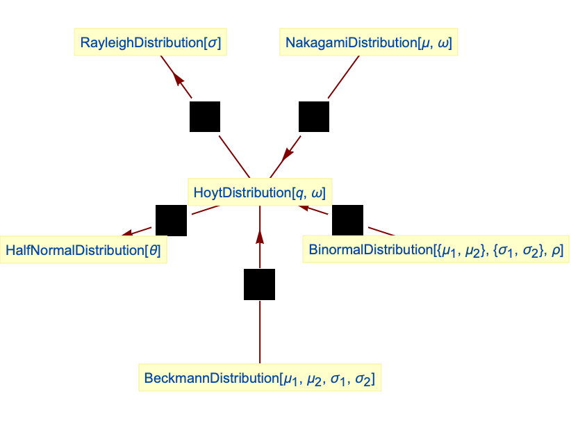- HoytDistribution is closely related to a number of other distributions. For example, the work of Hoyt establishes a relationship between HoytDistribution and NormalDistribution by way of complex normal variates. Moreover, HoytDistribution is linked to both GammaDistribution and ChiDistribution, in the sense that if YGammaDistribution[m,ω/m] and ZChiDistribution[2 m], then