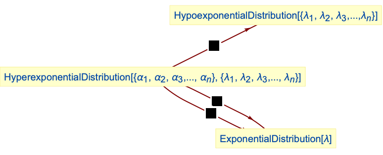 - The hyperexponential distribution is related to a number of other distributions. HyperexponentialDistribution is an obvious generalization of ExponentialDistribution in that an exponential distribution ExponentialDistribution[λ1] can be viewed both as a single-phase hyperexponential HyperexponentialDistribution[{1},{λ1}] and as a hyperexponential HyperexponentialDistribution[{α1,α2,…,αm},{λ1,λ1,…,λ1}] in which the phase rates λ1 are all equal. HyperexponentialDistribution can also be realized as a mixture distribution whose weights are each ExponentialDistribution. In addition, HyperexponentialDistribution can be transformed into HypoexponentialDistribution (and vice versa); can be obtained from GammaDistribution, LaplaceDistribution, BenktanderWeibullDistribution, LogisticDistribution, ParetoDistribution, PearsonDistribution, PowerDistribution, and RayleighDistribution by composing transformations of ExponentialDistribution with TransformedDistribution and/or TruncatedDistribution; and is related to CoxianDistribution, ExtremeValueDistribution, GumbelDistribution, FrechetDistribution, and WeibullDistribution, among others.