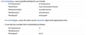 "AirTemperature" air temperature "MoonPhase" moon illumination fraction "RelativeHumidity" humidity fraction "WindDirection" wind direction "WindSpeed" wind speed - In IconData[type,value], the value can be a Quantity object with appropriate units.