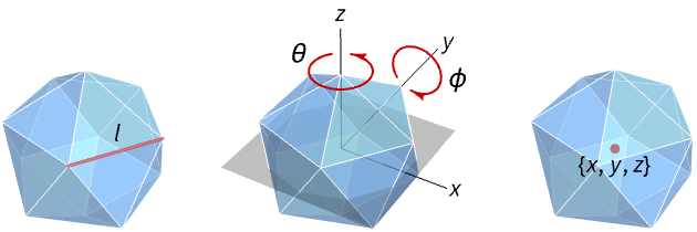 - Icosahedron[l] is equivalent to Icosahedron[{0,0,0},l].