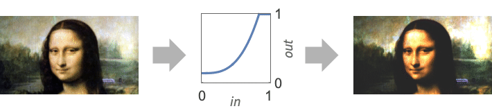 View the pixel transformation function and its effect on the example image and its histogram as the contrast, brightness and gamma parameters are changed: