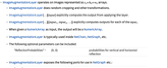 "ReflectionProbabilities" {0,0} probabilities for vertical and horizontal reflection - ImageAugmentationLayer exposes the following ports for use in NetGraph etc.: