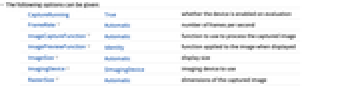 CaptureRunning True whether the device is enabled on evaluation FrameRate Automatic number of frames per second ImageCaptureFunction Automatic function to use to process the captured image ImagePreviewFunction Identity function applied to the image when displayed ImageSize Automatic display size ImagingDevice $ImagingDevice imaging device to use RasterSize Automatic dimensions of the captured image