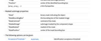 "Mask" binary mask indicating the object "MaskBoundingBox" the bounding box of the masked image "MaskCentroid" centroid of the mask "MaskedImage" subimage masked by the component shape "MaskMedoid" medoid of the mask "MaskPosition" center of the mask bounding box - The following options can be given: