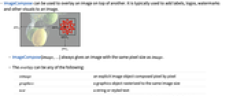 - ImageCompose[image,{o1,o2,…}] composes multiple images onto image.
