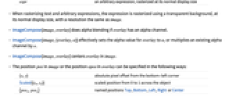 oimage an explicit image object composed pixel by pixel graphics a graphics object rasterized to the same image size text a string or styled text expr an arbitrary expression, rasterized at its normal display size - When rasterizing text and arbitrary expressions, the expression is rasterized using a transparent background, at its normal display size, with a resolution the same as image.