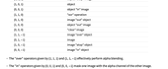 {1,1,1} object "over" image (default) {0,1,1} object "atop" image {1,0,1} object {0,0,1} object "in" image {1,1,0} "xor" operation {0,1,0} image "out" object {1,0,0} object "out" image {0,0,0} "clear" image {1,1,-1} image "over" object {0,1,-1} image {1,0,-1} image "atop" object {0,0,-1} image "in" object - The "over" operators given by {1,1,1} and {1,1,-1} effectively perform alpha blending.