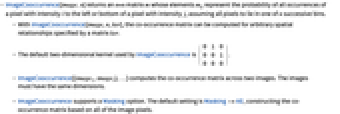 - With ImageCooccurrence[image,n,ker], the co-occurrence matrix can be computed for arbitrary spatial relationships specified by a matrix ker.