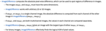 - If image1 or image2 is a single-channel image, the absolute difference is computed from each channel of the other image in ImageDifference[image1,image2].