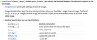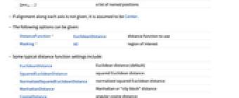 EuclideanDistance Euclidean distance (default) SquaredEuclideanDistance squared Euclidean distance NormalizedSquaredEuclideanDistance normalized squared Euclidean distance ManhattanDistance Manhattan or "city block" distance CosineDistance angular cosine distance CorrelationDistance correlation coefficient distance f function f that is given the overlapping regions of the two images as arguments - The following special distance functions are also supported: