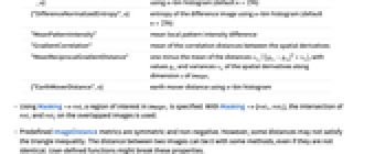 of the spatial derivatives along dimension s of imagei{"EarthMoverDistance",n} earth mover distance using n-bin histogram - Using Masking->roi, a region of interest in image1 is specified. With Masking->{roi1,roi2}, the intersection of roi1 and roi2 on the overlapped images is used.