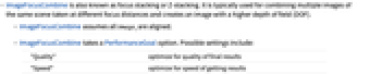 - ImageFocusCombine takes a PerformanceGoal option. Possible settings include: