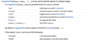 "type" entity type, as used in Interpreter "concept" named concept, as used in "Concept" entities "word" English word, as used in WordData wordspec word sense specification, as used in WordData Entity[…] any appropriate entity category1|category2|… any of the categoryi - By default, ImageIdentify returns objects of the form Entity["Concept",…].