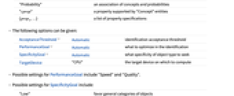 AcceptanceThreshold Automatic identification acceptance threshold PerformanceGoal Automatic what to optimize in the identification SpecificityGoal Automatic what specificity of object type to seek TargetDevice "CPU" the target device on which to compute - Possible settings for PerformanceGoal include "Speed" and "Quality".