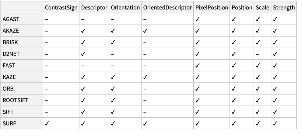 "AGAST" Adaptive and Generic Accelerated Segment Test "AKAZE" Accelerated KAZE and binary descriptors "BRISK" Binary Robust Invariant Scalable Keypoints "FAST" Features from Accelerated Segment Test "KAZE" nonlinear scale-space detector and descriptor "ORB" FAST detector and Binary Robust Independent Elementary Features (BRIEF) descriptor "SIFT" Scale-Invariant Feature Transform detector and descriptor "RootSIFT" SIFT keypoints with an improved descriptor "SURF" Speeded-Up Robust Features - When a property is not available with a specified method, the corresponding element in the result is set to Missing["NotAvailable"]. »