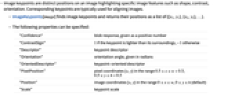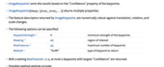 - ImageKeypoints[image,{prop1,prop2,…}] returns multiple properties.