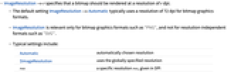 - ImageResolution->r specifies that a bitmap should be rendered at a resolution of r dpi.