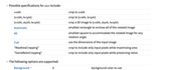 width crop to width {width,height} crop to {width,height} {width,depth,height} crop a 3D image to {width,depth,height} Automatic smallest rectangle to enclose all of the rotated image All smallest square to accommodate the rotated image for any rotation angle Full use the dimensions of the input image "MaxAreaCropping" crop to include only input pixels while maximizing area "SameRatioCropping" crop to include only input pixels while preserving ratios - The following options are supported: