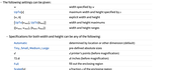 w width specified by w UpTo[s] maximum width and height specified by s {w,h} explicit width and height {UpTo[wmax],UpTo[hmax]} width and height maximums {{wmin,wmax},{hmin,hmax}} width and height ranges - Specifications for both width and height can be any of the following: