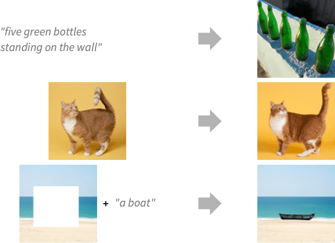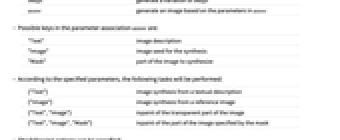{"Text"} image synthesis from a textual description {"Image"} image synthesis from a reference image {"Text","Image"} inpaint of the transparent part of the image {"Text","Image","Mask"} inpaint of the part of the image specified by the mask - The following options can be specified:
