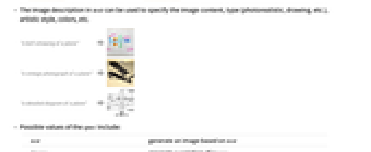 - The image description in text can be used to specify the image content, type (photorealistic, drawing, etc.), artistic style, colors, etc.