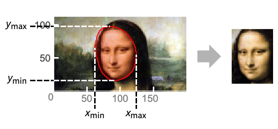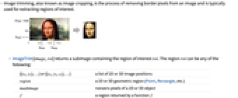 - ImageTrim[image,roi] returns a subimage containing the region of interest roi. The region roi can be any of the following: