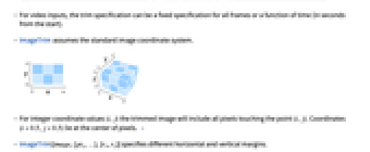 {{x1,y1},…}or {{x1,y1,z1},…} a list of 2D or 3D image positions region a 2D or 3D geometric region (Point, Rectangle, etc.) maskimage nonzero pixels of a 2D or 3D object f a region returned by a function f - For video inputs, the trim specification can be a fixed specification for all frames or a function of time (in seconds from the start).