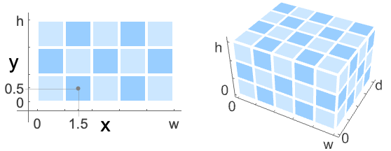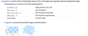 Automatic {{0,1},{0,h/w}} in 2D, {{0,1},{0,d/w},{0,h/w}} in 3D Full {{0,w},{0,h}} in 2D, {{0,1},{0,d},{0,h}} in 3D (default) {{left,right},{bottom,top}} explicit coordinate ranges in 2D {{left,right},{front,back},{bottom,top}} explicit coordinate ranges in 3D - With Resampling->"Nearest", when the position pos lies on a boundary between pixels, the average of the pixels surrounding pos is returned. »
