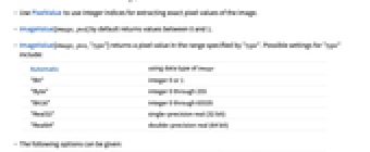 - ImageValue[image,pos,"type"] returns a pixel value in the range specified by "type". Possible settings for "type" include:
