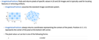 - ImageValuePositions finds and returns pixels of specific values in 2D and 3D images and is typically used for locating features or removing artifacts.