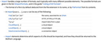 - Import handles a large number of formats, each typically with many different possible elements. The possible formats are given in the list $ImportFormats, and in the guide "Listing of All Formats".