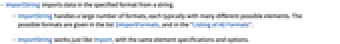 - ImportString handles a large number of formats, each typically with many different possible elements. The possible formats are given in the list $ImportFormats, and in the "Listing of All Formats".