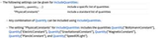 {quantity1,quantity2,…} include a specific list of quantities "PhysicalConstants" include a standard list of quantities - Any combination of Quantity can be included using IncludeQuantities.