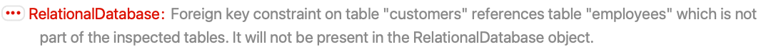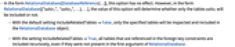 - With the default setting IncludeRelatedTablesFalse, only the specified tables will be inspected and included in the RelationalDatabase object.