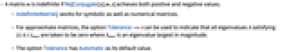 - For approximate matrices, the option Tolerance->t can be used to indicate that all eigenvalues λ satisfying λ≤t λmax are taken to be zero where λmax is an eigenvalue largest in magnitude.