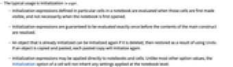 - Initialization expressions may be applied directly to notebooks and cells. Unlike most other option values, the Initialization option of a cell will not inherit any settings applied at the notebook level.