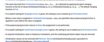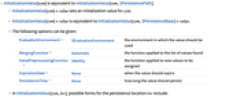EvaluationEnvironment $EvaluationEnvironment the environment in which the value should be used MergingFunction Automatic the function applied to the list of values found ValuePreprocessingFunction Identity the function applied to new values to be assigned ExpirationDate None when the value should expire PersistenceTime None how long the value should persist - In InitializationValue[sym,loc], possible forms for the persistence location loc include: