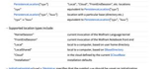 PersistenceLocation["type"] "Local", "Cloud", "FrontEndSession", etc. locations "type" equivalent to PersistenceLocation["type"] PersistenceLocation["type","base"] location with a particular base (directory etc.) "type""base" equivalent to PersistenceLocation["type","base"] - Supported location types include: