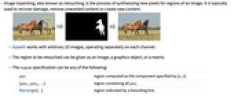 pos region computed as the component specified by {x,y} {pos1,pos2,…} region containing all posi Rectangle[…] region indicated by a bounding box image an exact set of pixels given as an image - Inpaint always gives an image of the same dimensions and the same type as image.