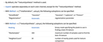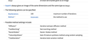 "NoiseModel" "Gaussian" "Gaussian", "Laplacian", or "Poisson" "Regularization" Automatic regularization parameter - With Method->{"TextureSynthesis",subopt}, the following suboptions can be specified: