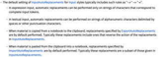 - When material is copied from a notebook to the clipboard, replacements specified by ExportAutoReplacements are by default performed. Typically these replacements include ones that reverse the action of the replacements in InputAutoReplacements.