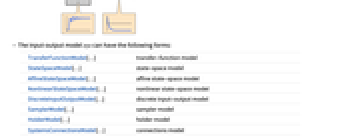 TransferFunctionModel[…] transfer-function model StateSpaceModel[…] state-space model AffineStateSpaceModel[…] affine state-space model NonlinearStateSpaceModel[…] nonlinear state-space model DiscreteInputOutputModel[…] discrete input-output model SamplerModel[…] sampler model HolderModel[…] holder model SystemsConnectionsModel[…] connections model - InputOutputResponse[{sys,ics},…] can be used to specify initial conditions ics.