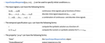 {u1[t],…,up[t]} continuous-time signals ui[t] as functions of time t {{u11,…,u1k},…,{up1,…,upk}} discrete-time signal sequences {ui1,…,uik} {…,ui[t],…,{uj1,…,ujk},…} a combination of continuous- and discrete-time signals - The temporal specification tspec can have the following forms: