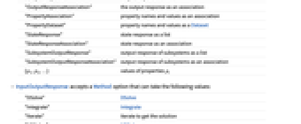 "SubsystemOutputResponse" output response of subsystems as a list "SubsystemOutputResponseAssociation" output response of subsystems as an association {p1,p2,…} values of properties pi - InputOutputResponse accepts a Method option that can take the following values: