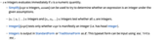 - Simplify[expr∈Integers,assum] can be used to try to determine whether an expression is an integer under the given assumptions.