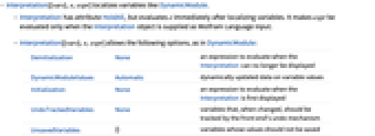 Deinitialization None an expression to evaluate when the Interpretation can no longer be displayed DynamicModuleValues Automatic dynamically updated data on variable values Initialization None an expression to evaluate when the Interpretation is first displayed UndoTrackedVariables None variables that, when changed, should be tracked by the front end's undo mechanism UnsavedVariables {} variables whose values should not be saved