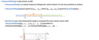 Association the values (the keys are ignored) » SparseArray as an array, equivalent to Normal[data] » QuantityArray quantities as an array » WeightedData based on the underlying EmpiricalDistribution » EventData based on the underlying SurvivalDistribution » TimeSeries, TemporalData, … vector or array of values (the time stamps ignored) » Image,Image3D RGB channel's values or grayscale intensity value » Audio amplitude values of all channels » DateObject, TimeObject list of dates or list of times » - InterquartileRange[dist] is given by