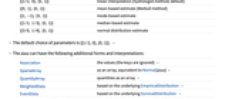 {{0, 0}, {1, 0}} inverse empirical CDF {{0, 0}, {0, 1}} linear interpolation (California method) {{1/2, 0}, {0, 0}} element numbered closest to p n {{1/2, 0}, {0, 1}} linear interpolation (hydrologist method; default) {{0, 1}, {0, 1}} mean‐based estimate (Weibull method) {{1, -1}, {0, 1}} mode‐based estimate {{1/3, 1/3}, {0, 1}} median‐based estimate {{3/8, 1/4}, {0, 1}} normal distribution estimate - The default choice of parameters is {{1/2,0},{0,1}}. »
