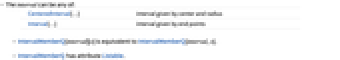 CenteredInterval[…] interval given by center and radius Interval[…] interval given by end points - IntervalMemberQ[interval][x] is equivalent to IntervalMemberQ[interval,x].